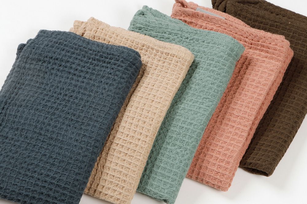 Waffle kjøkkenhåndklærne finnes i fem flotte farger; Olive, Rose, Sand, Soft Green og Blue og kjøkkenhåndkleet som mottas leveres i assorterte farger.