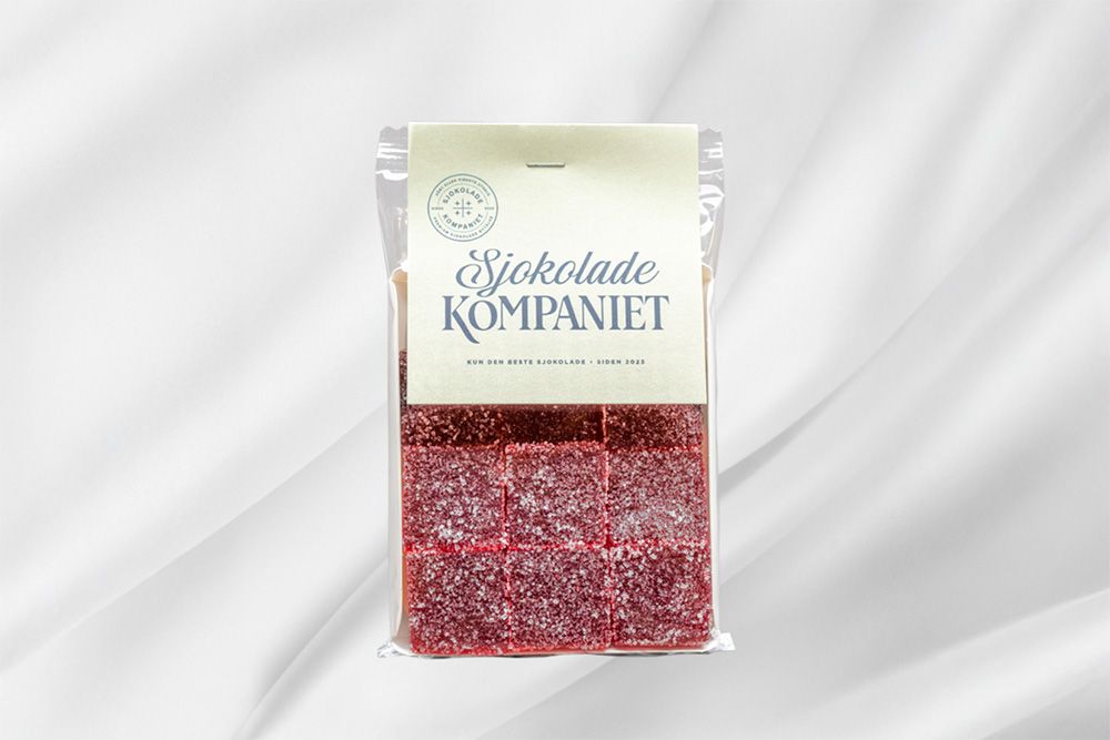 Pâte de Fruits Bringebærgelé. En liten eske med hjemmelaget bringebærgelé. Skåret opp i perfekte ruter. Produktet er vegansk.