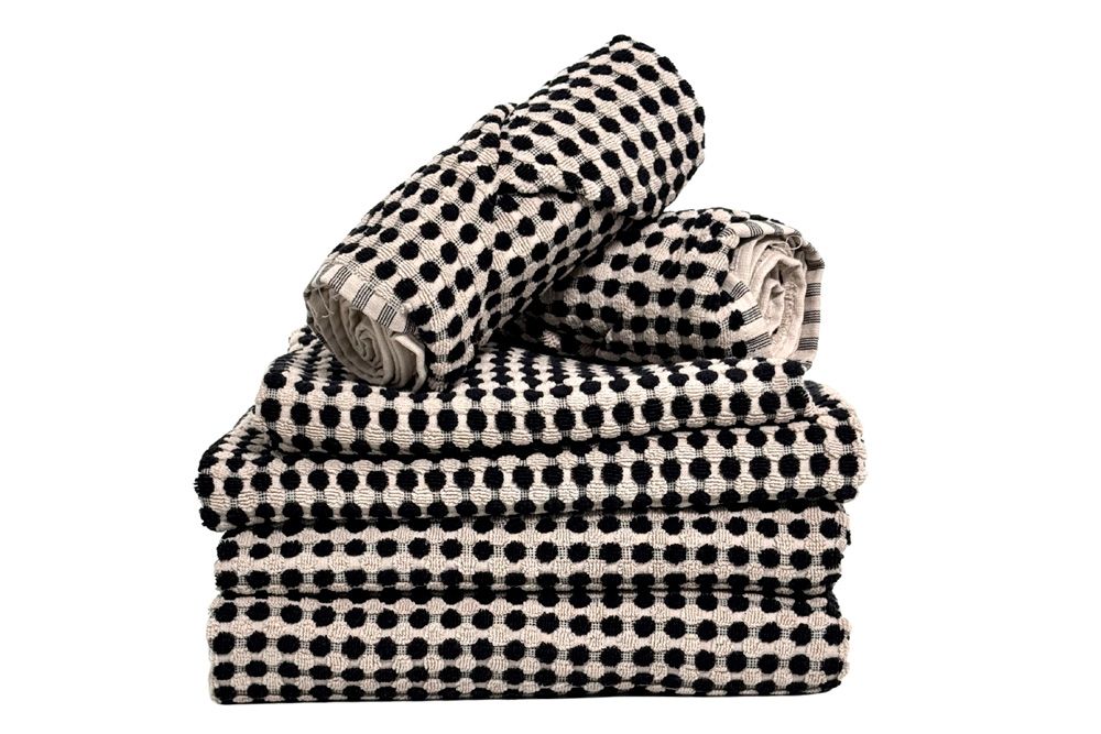 Håndklærne er laget med et enkelt og likevel særegent mønster med grafiske, sorte prikker, som er i flott kontrast til bakgrunnsfargen i en varm beige nyanse. Kanten er laget tone i tone, noe som gir en fin detalj til det mønstrede utseendet.