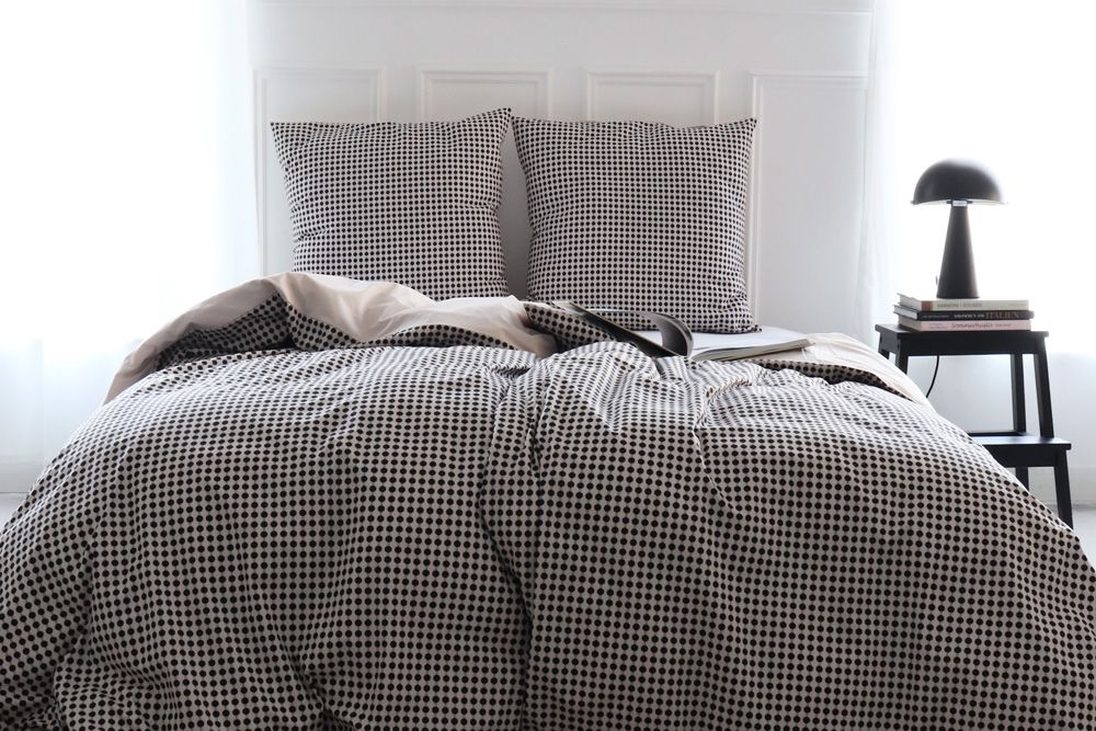 Sengesettet fra Cotton Lover er både mykt, lekkert og stilrent. Det fine dobbeltsidede designet har et grafisk prikkete mønster i sort og beige på den ene siden og ensfarget på den andre, hvilket gir mulighet for å endre utseende etter humør uten å måtte bytte sengetøy.