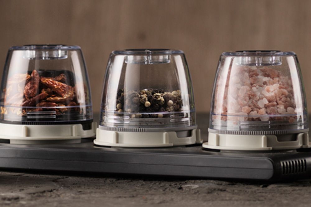 Det smarte med FinaMill er at hvert krydder har sin egen beholder med integrert kvern, som hver enkelt kan justeres, avhengig av hvor grovt du vil ha kryddere malt.