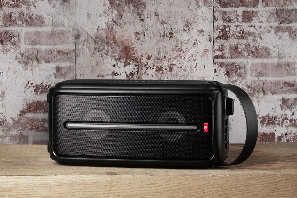 Med sin solide konstruksjon er Hi5-høyttaleren utviklet for å tåle en støyt. Det innebygde håndtaket gjør den lett å ta med seg, den veier kun 1,5 kg.