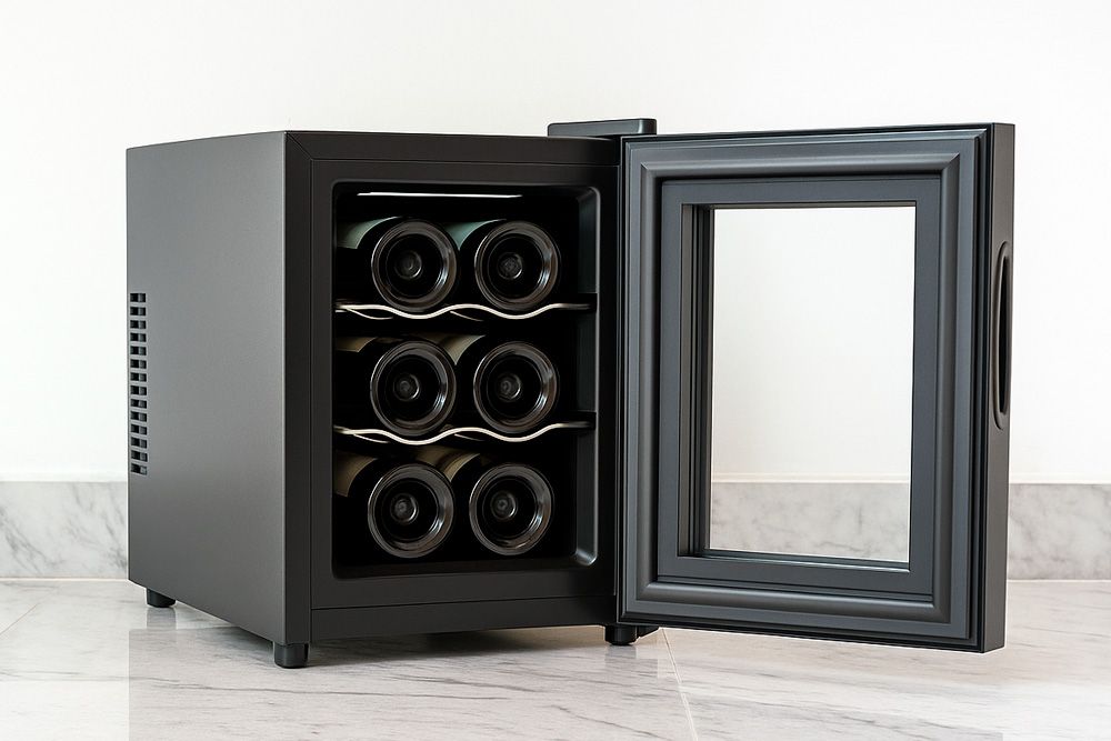 Det stilrene og praktiske vinkjøleskapet fra PowerTrend med plass til 6 flasker er den ideelle løsningen for kompakt og elegant oppbevaring av vin.