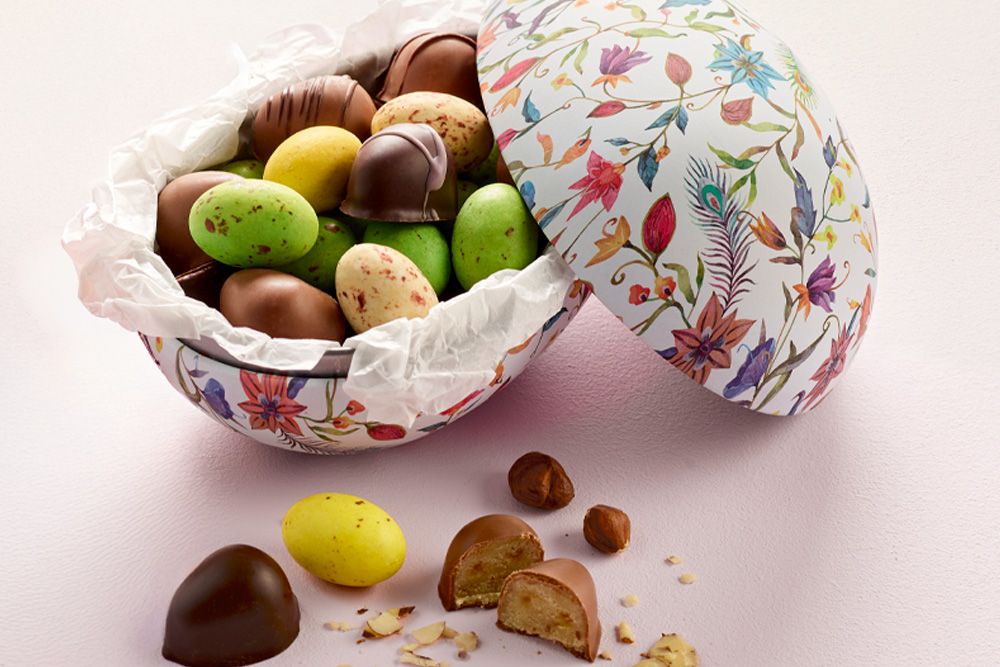 Dette metallegget med vakre blomster er fylt med deilige gourmet- og marsipanegg – en herlig kombinasjon til påskens søte øyeblikk. Egget har et elegant og dekorativt uttrykk, og innholdet byr på en deilig variasjon av fyldige smaksnyanser i sjokolade og marsipan, som gir en allsidig blanding av klassiske favoritter og mer eksklusive påskeegg. Det solide metallegget kan lagres og gjenbrukes år etter år og egner seg perfekt til å fylles med nye godsaker når påsken kommer tilbake.
