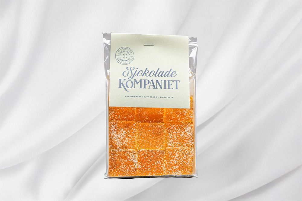 Pâte de Fruits Pasjonsfruktgelé. En liten eske med hjemmelaget pasjonsfruktgelé. Skåret opp i perfekte ruter. Produktet er vegansk.