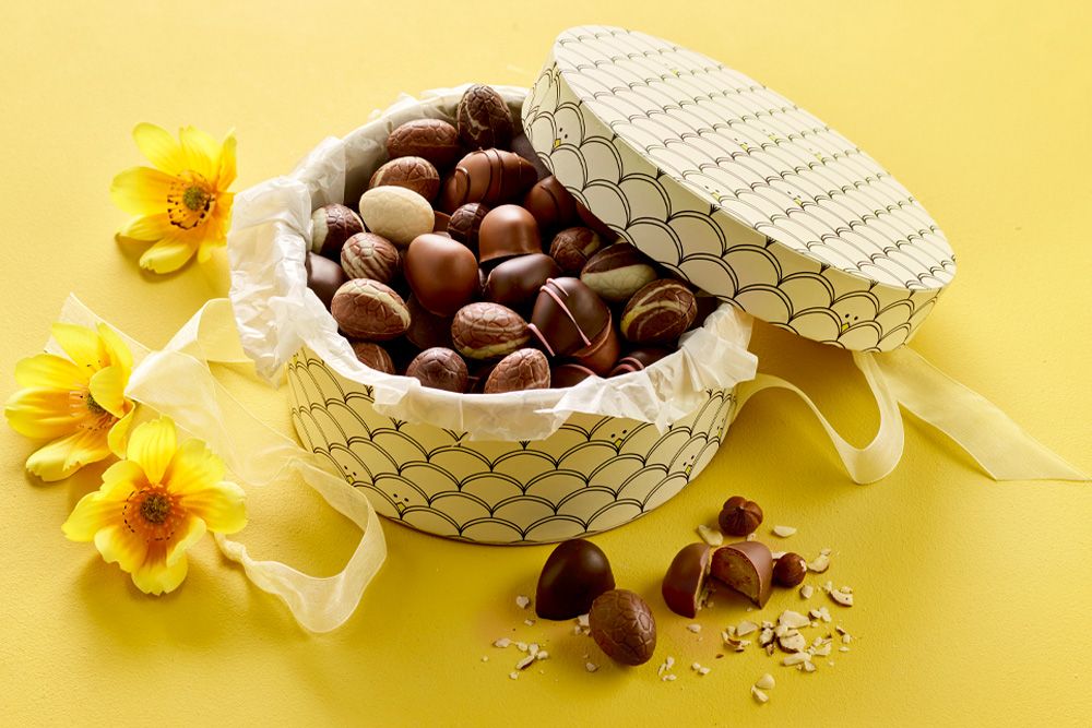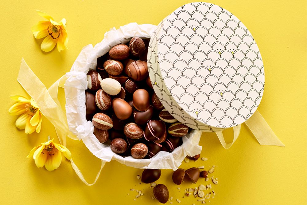 Utforsk denne flotte hatteesken fylt med smakfulle herligheter. Innholdet byr på deilige marsipan- og luksusegg, nøye utvalgt for deres høye kvalitet og fine smak – en harmonisk kombinasjon som inviterer til nytelse og hyggelige påskeøyeblikk.