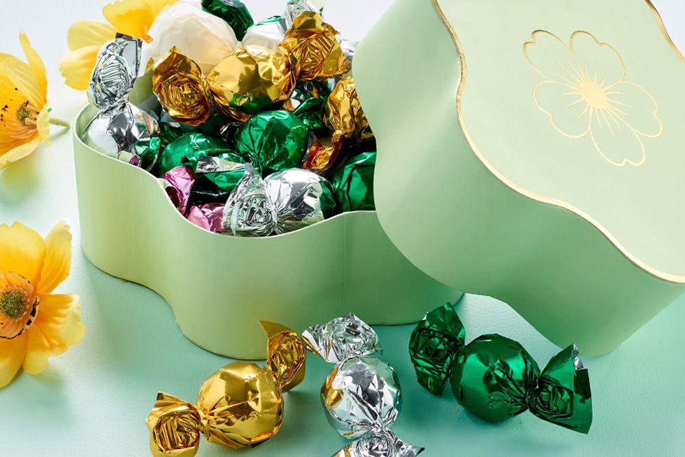 Gå på oppdagelse i denne vakre esken formet som en blomst og fylt med delikate sjokoladekuler. Den fine, dekorative utformingen gir esken et elegant og innbydende uttrykk.