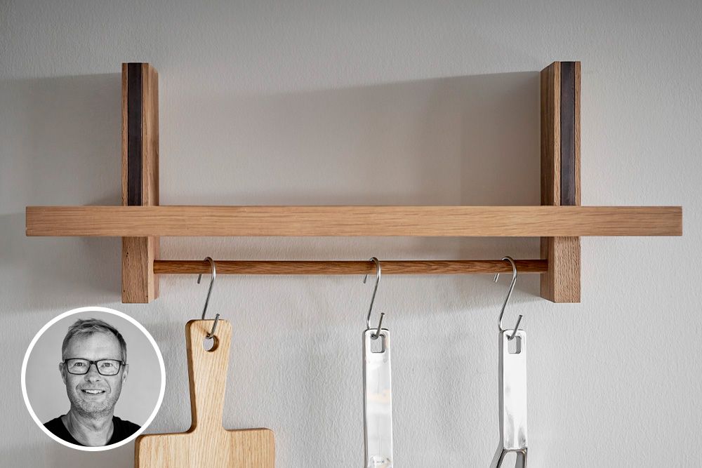 Denne funksjonelle Esrum-kjøkkenhyllen er designet av danske Mads Odgård, som er anerkjent for sitt fokus på minimalistisk design. Hyllen fungerer både som avsettingshylle til eksempelvis kopper, mens stangen med kroker samtidig gjør det mulig å henge panner eller andre ting bort.