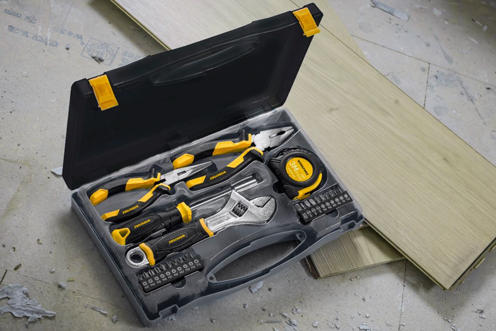 Settet inneholder essensielle verktøy som en kombinasjonstang, nebbtang, justerbar skiftenøkkel, et stålmålebånd og en multiskrutrekker med 20 utskiftbare bits som kan brukes til et vell av forskjellige oppgaver.
